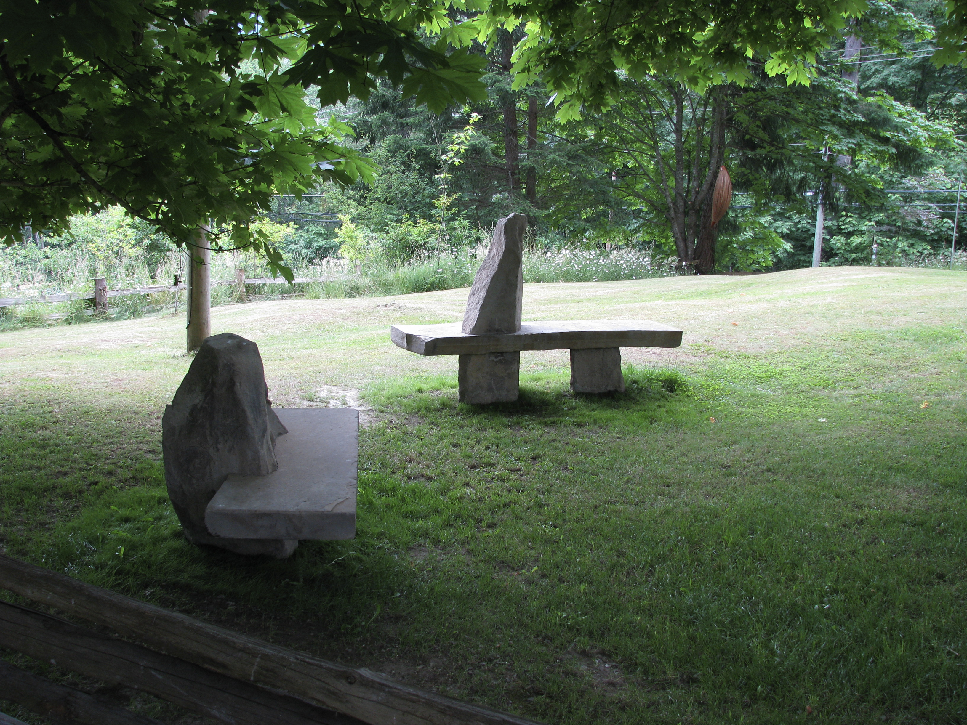 Stone benches reflect the meditative quality of gardens and stopping time.
